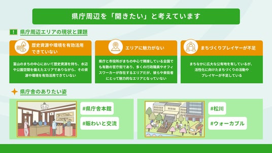 富山駅と商店街地区の中間に位置する県庁舎本館は、90年の歴史を持ち、戦災からの復興の歩みを物語る大切な建物である一方で、「近づきにくい」「閉鎖的」といった声もあります。県では、この周辺エリアが「いつでも訪れる人々が憩いと愉しみを感じることができる、多様な居場所」となるよう、利活用に向けた検討を進めています。そこで今回、県民の皆さま、富山県にゆかりのある皆さまから、「県庁周辺がどんな場所になっていたらうれしいか」、広くご意見を募集し、今後の施策に活かす方針です。