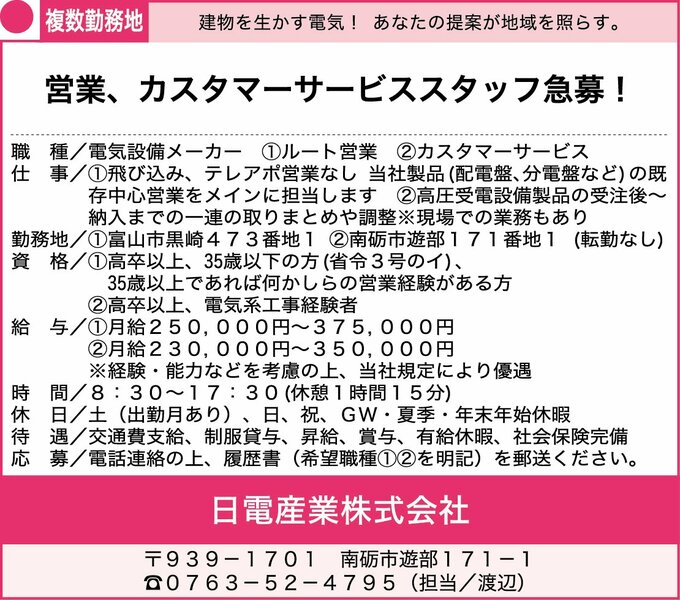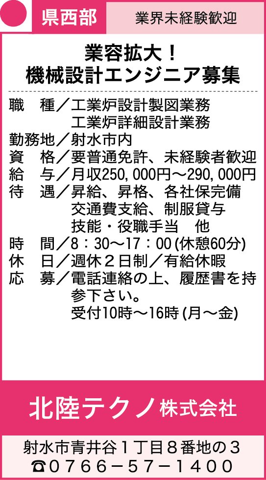 PR 【11月20日掲載】日電産業株式会社、北陸テクノ株式会社、(株)ビレッジ・フィールドふる里の風グループ【2025】 11月20日掲載開始分 2025年11月20日 05:00 正社員 求人企業のHP メールで問い合わせる 0763-52-4795(担当/渡辺) 正社員 求人企業のHP メールで問い合わせる 0766-57-1400 パート 求人企業のHP メールで問い合わせる 076-422-0218 この機能は会員限定です。 お気に入りの記事を保存し、マイページで読むことができます。 ログイン 会員登録はこちら