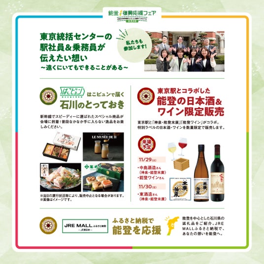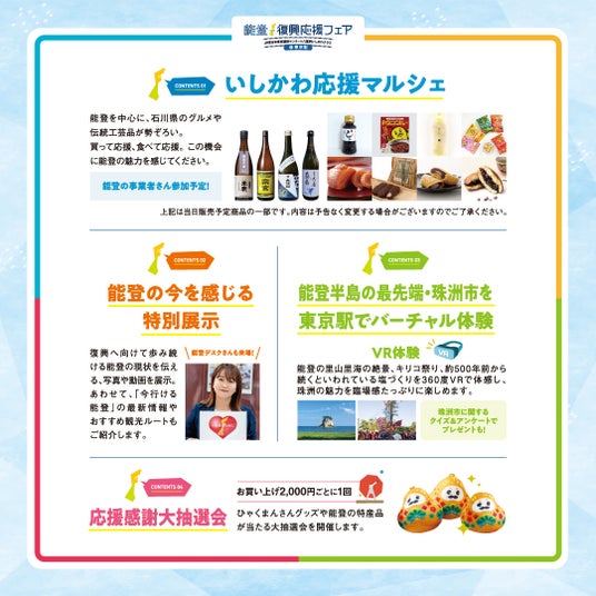 能登半島地震の応援消費の気運を継続させるため、首都圏アンテナショップ「八重洲いしかわテラス」では、今年度首都圏主要駅等において「能登復興応援フェア」を開催することとしており、この度、石川県と東日本旅客鉄道株式会社が協力してJR東京駅構内でフェアを開催します。