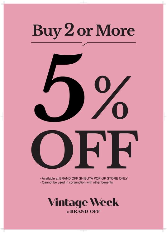 イベント期間中「Vintage Week by BRAND OFF」会場にて2点以上の商品をご購入いただいたお客様を対象に、お会計総額から5%OFFとなる特別キャンペーン「2 BUY or More 5%OFF」を実施します。