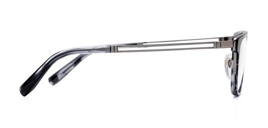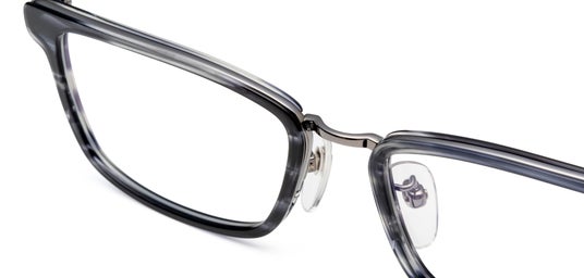 知的な印象がありつつ、旬な雰囲気を取り入れたコンビネーションフレーム。フロントには、メタルのフロントバーとアセテート枠を組み合わせており、異なる質感のコントラストが映える逸品に仕上がりました。リムが太くレンズの厚みが目立ちにくいため、強度数の方でもスマートに着用できるデザインです。