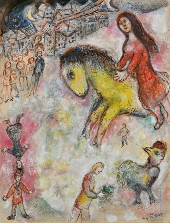 深いブルーが印象的な「恋人たちと花束」は、大きな花束の下で寄りそう男女の姿から温かな情感が伝わる。70年制作の「愛の使者」は、南フランスの陽光に似た鮮やかな黄色など明るい色であふれた作品だ。故郷ベラルーシの村の景色や、サーカスに興じる人々、鳥、花束などおなじみのモチーフと共に、ベラを思わせるあでやかな女性が馬に乗った姿を描いた。