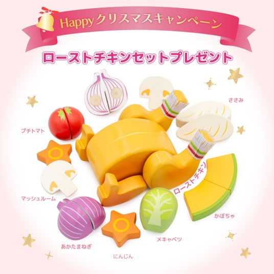株式会社クリエイティブヨーコ(本社:長野県長野市 代表取締役社長:北原 武幸)は、オリジナルデザインの学童・日用品雑貨や知育玩具などを提案する『マザーガーデン』において、クリスマスシーズンに合わせ、対象のキッチンシリーズをご購入いただいたお客さまに、子どもたちが憧れるごちそうメニューが再現できる木製の「ローストチキンセット」をプレゼントするキャンペーンを開催しています。