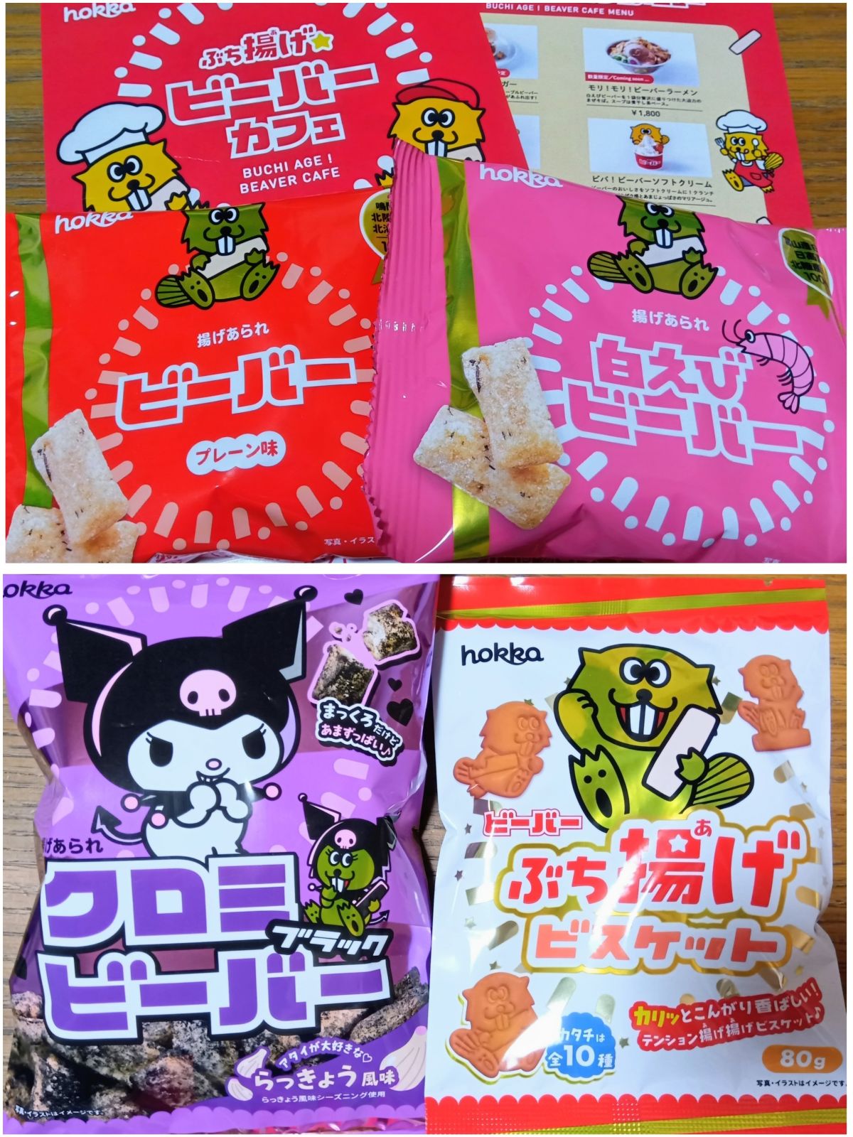 初めて見る「クロミビーバー(らっきょう風味)」と「ぶち揚げビスケット」を購入しました。そしてアンケートに答えると、小袋ビーバーがもらえ、アゲアゲでした✨