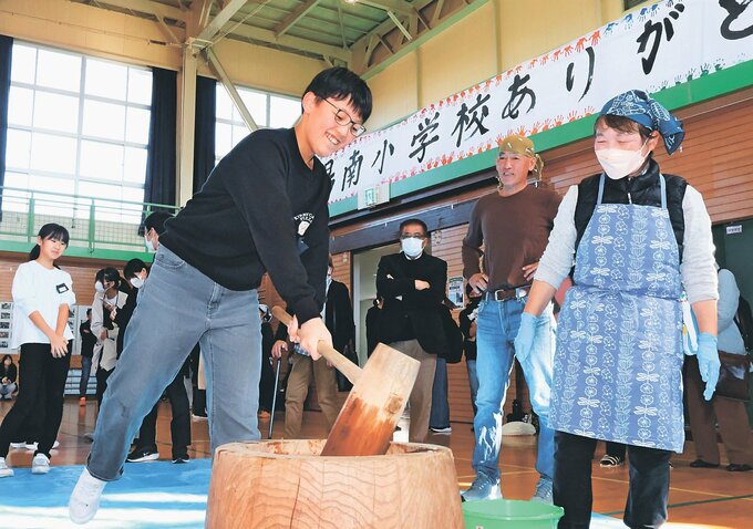 ミニ文化祭では、コロナ禍で2020年から中止していた餅つき体験や三世代会食が6年ぶりに復活。地元農家から餅米20キロやサトイモ、サツマイモ、大根の提供を受けた。子どもたちは「よいしょ」のかけ声に合わせ、力いっぱい餅をついた。きな粉とあんこをまぶしたつきたての餅が、豚汁と共に振る舞われた。