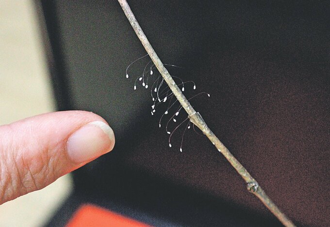近くに住む氏子の男性が数日前に自宅の庭で発見した。珍しい卵を神様に見てもらおうと、19日に同八幡宮に届け、20日に奉納した。細い糸の先に小さな卵が20個ほど付いており、糸は長いもので1センチ程度とごく小さい。