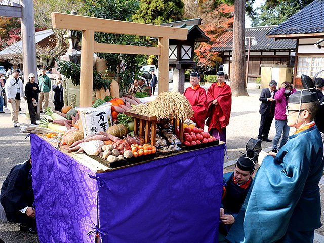射水神社は23日、富山県高岡市古城の同神社で新嘗(にいなめ)祭を開いた。県内から奉納された初穂米や野菜を台車に積み上げて宮に引き入れる「初穂曳(はつほびき)」を行い、秋の実りに感謝した。