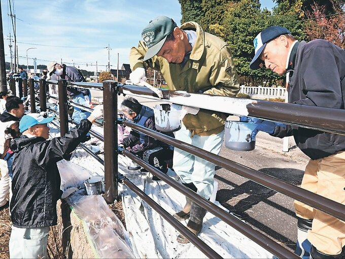 住民ら約40人が神社前の市道のガードパイプ(長さ約60メートル)に丁寧にペンキを塗った。大野に実家がある加藤千尋さん(34)=射水市八塚=は子ども2人と参加。長男の凰聖(こうせい)さん(7)=大島小学校1年=は「みんなで塗るのが楽しい。きれいな色になってうれしい」と笑みを見せた。神社総代の池田義之さん(78)は「住民の皆さんが協力的にやってくれた。景観づくりを通して地域のつながりが強くなった」と話した。