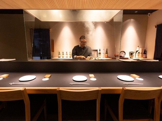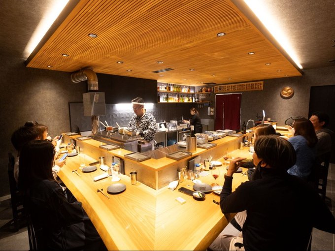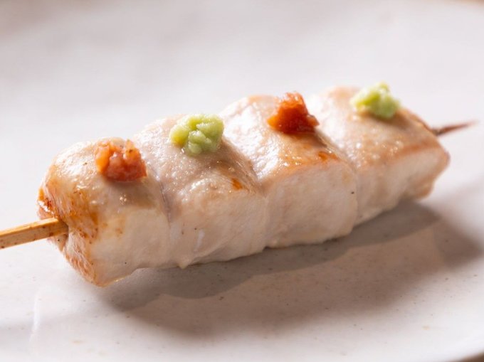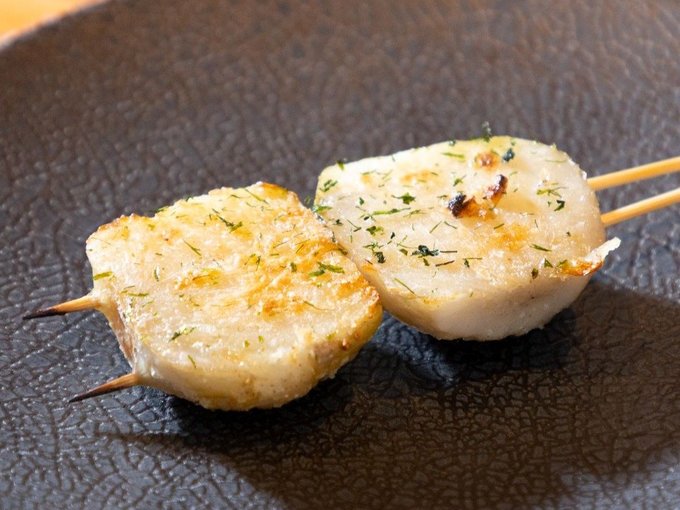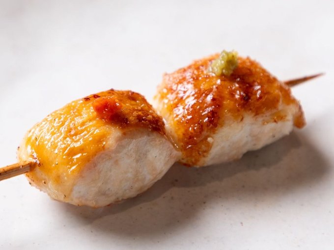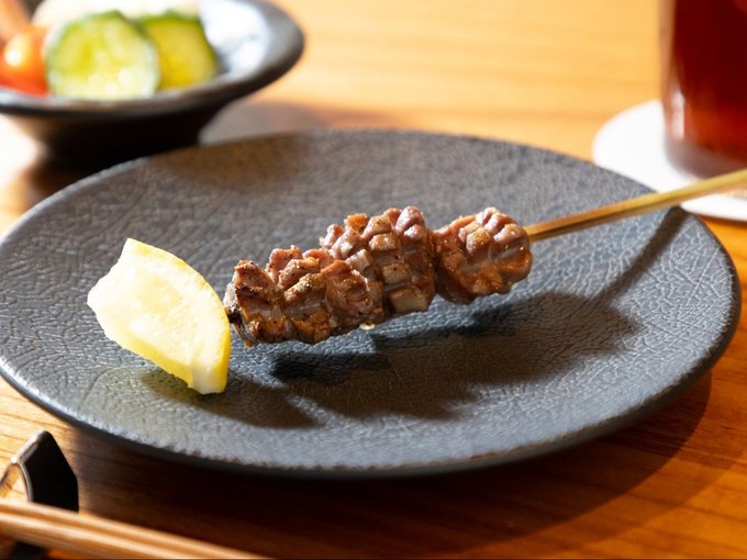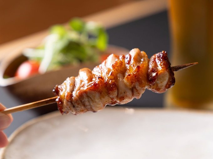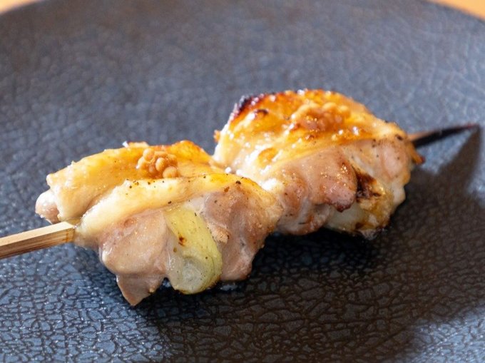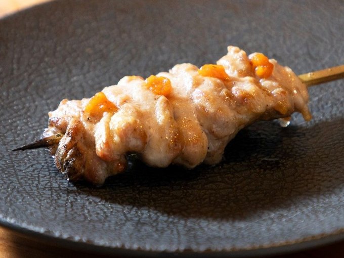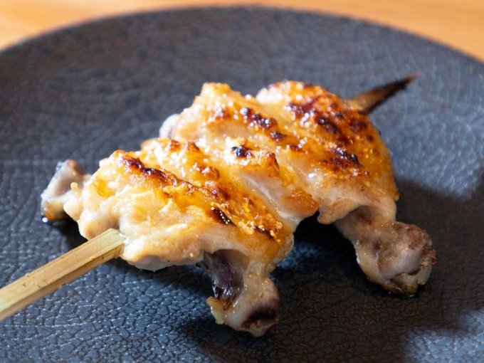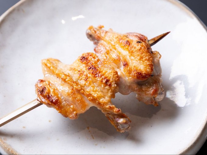 シックな黒いカウンター。高級感のある照明。一般的な焼き鳥店と違うこの店は、予約制でコースを扱う。焼き台のあるカウンター越しに一本ずつ提供され、ビールや日本酒のほかワイン、シャンパンと合わせて、上質な時間を過ごすことができる。2024年12月にオープンし、人気を集めている。