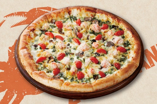 ズワイガニ、マッシュルーム、チェリートマト、プレミアムチーズブレンド、エキストラチーズ、バジルクリーム ※バジルクリームにはオニオン含む