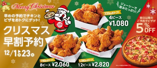 12月1日(月)~23日(火)の期間中、クリスマス早割を実施いたします。フライドチキンとピザの最強コンビで、皆さまに笑顔あふれるクリスマスをお届けします。