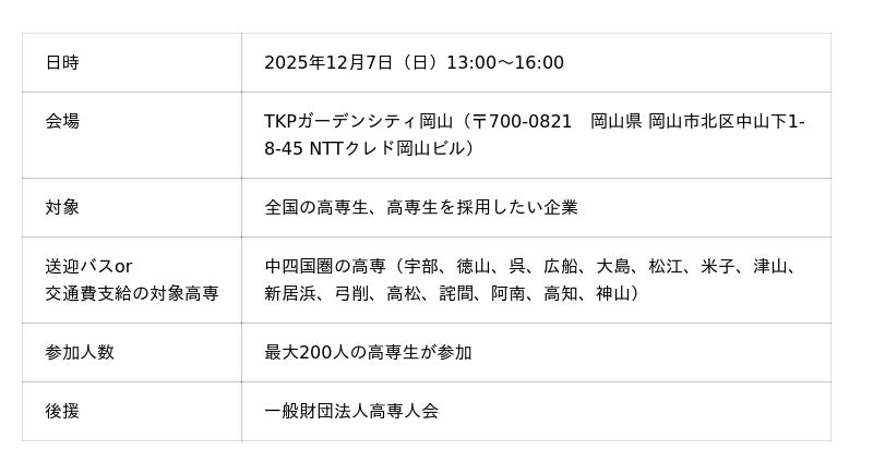 高専生を対象にしたキャリアパートナー事業を展開する株式会社プロッセル(本社:新潟県新潟市、代表取締役CEO:横山和輝、以下「プロッセル」)は、2025年12月7日(日)に高専生限定の就活イベント『With KOSEN進路研究セミナーin岡山』を開催いたします。本イベントでは、中四国圏の高専生をメイン対象として、最大200名の高専生と、高専生採用に関心を持つ企業が直接交流する機会を提供します。