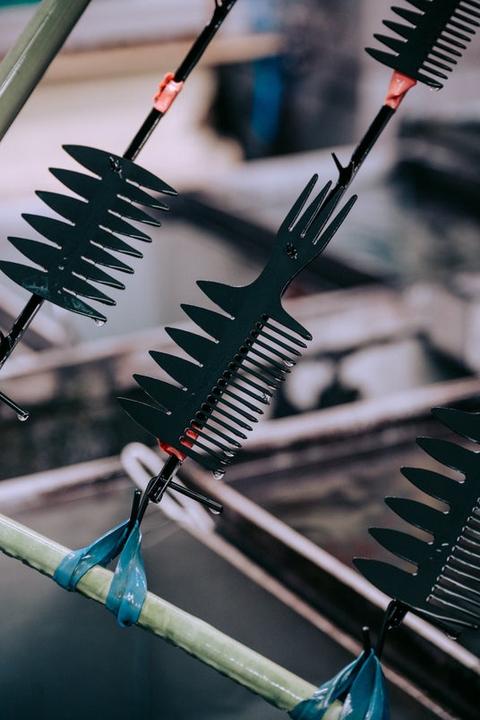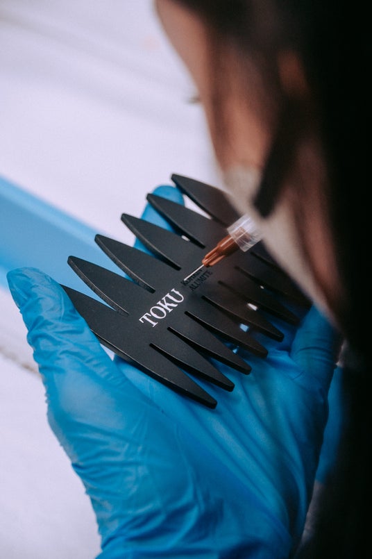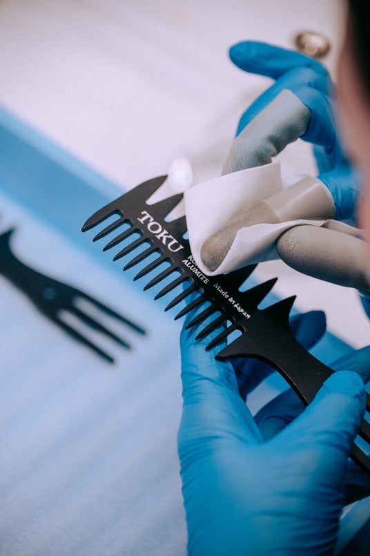 製造は長野県岡谷市で、加工・アルマイト・彫刻・色入れまで一貫生産。仕上げは職人が一本ずつ専用の針で色を入れます。量産では再現できないクラフト感と温もりを持ち、同じものが一つとして存在しない特別な一本に仕上がります。日本の「ものづくり」支える中小企業の技術と人の手による仕上げが融合した、新時代のコームです。