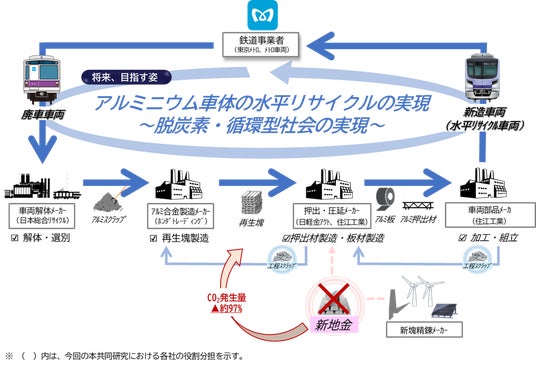 東京地下鉄株式会社(本社:東京都台東区、代表取締役社長:小坂 彰洋、以下「東京メトロ」)、メトロ車両株式会社(本社:東京都台東区、代表取締役社長:中澤 英樹、以下「メトロ車両」)、株式会社ホンダトレーディング(本社:東京都千代田区、代表取締役 社長執行役員:夏目 達也、以下「ホンダトレーディング」)、日本総合リサイクル株式会社(本社:富山県高岡市、代表取締役社長:高倉 康氏、以下「日本総合リサイクル」)、日軽金アクト株式会社(本社:東京都港区、代表取締役社長:五百竹 秀夫、以下「日軽金アクト」)、住江工業株式会社(本社:京都府京田辺市、代表取締役社長:小野 博富、以下「住江工業」)は共同で、半蔵門線8000系車両から半蔵門線18000系車両へのアルミニウム水平リサイクル※1を実現しました。