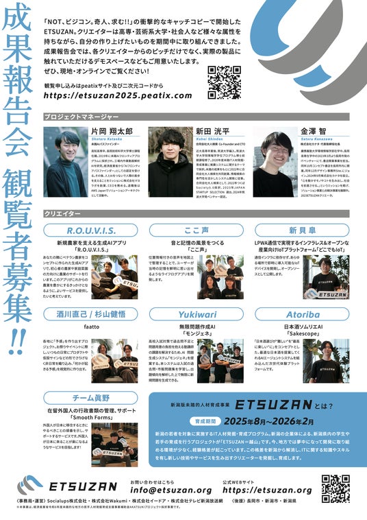 新潟の若者を対象に実施するIT人材発掘・育成を目的とした実践型プログラム「ETSUZAN」。2025年度の成果報告会を新潟市NINNOで行います