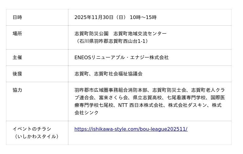 石川県志賀町でJRE志賀西海風力発電所を運営するENEOSリニューアブル・エナジー株式会社(以下「ERE」)は、志賀町の地域の皆様をはじめ近隣地域の方々を対象に、防災とスポーツを融合させたイベントを2025年11月30日(日)に開催いたします。