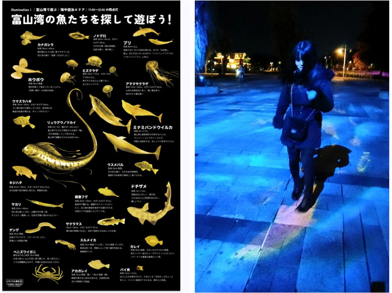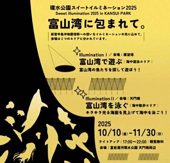 このイルミネーションは、能登半島沖地震復興への想いを込めてデザインされました。会場は「富山湾を泳ぐ(海中散歩エリア)」と「富山湾で遊ぶ(海中遊泳エリア)」の2ヶ所🌊