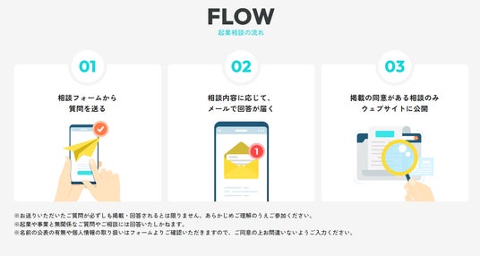 本サービスでは、起業に関するお悩みや質問を気軽にお送りいただけるよう、シンプルな3ステップで相談が完結します。