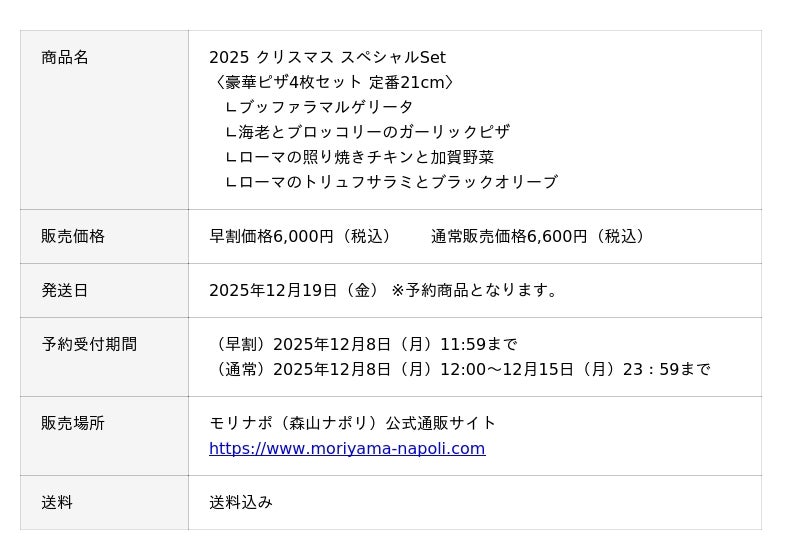 冷凍ピザ等の製造・販売をおこなう株式会社森山ナポリ(石川県金沢市)が手掛けるブランド「モリナポ」では、クリスマスシーズン限定の特別商品「2025 クリスマス スペシャルSet」の予約販売を、モリナポ公式通販サイトにて開始いたしました。今年もシチュエーションに応じて選べる2種類をご用意。少人数でも楽しめる定番21cmのピザ4枚セットと、ボリューム感のあるファミリーサイズ25cmのピザ3枚セットからお選びいただけます。いずれもモリナポ公式通販サイト限定の特別セットです。