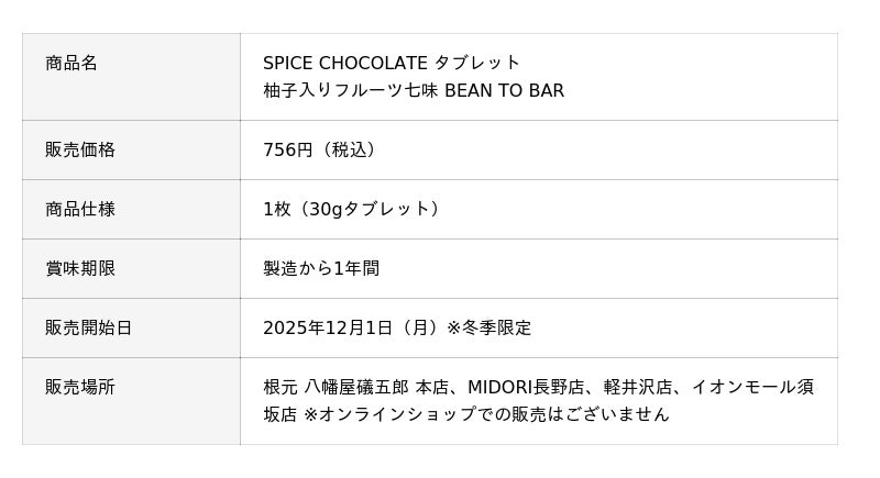 株式会社 八幡屋礒五郎(本社:長野県 代表取締役:九代目 室賀栄助)は、2025年12月1日(月)より、展開するスイーツブランド《Kongen Sweets》から、冬季限定《SPICE CHOCOLATE タブレット 柚子入りフルーツ七味 BEAN TO BAR》を販売いたします。