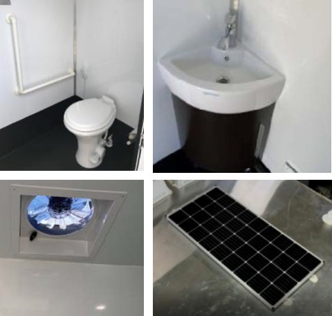 (写真・上段左)洋室便座を設置した個室空間4室を配置(同右)手洗い(写真・下段左)換気扇(同右)ルーフにはソーラーパネルを設置、バッテリーにオートチャージされ照明や水洗などの電源に活用