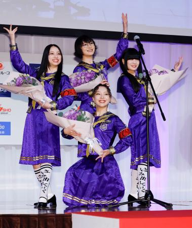 新しい学校のリーダーズの4人は、「真っ青に」した、おなじみのセーラー服に「はみ出していく」と記されたソックス姿を披露。リードボーカルのSUZUKAさんは「『青春日本代表』を自称しているんですが、(今日は全てを)青春の色に染め上げたい。今年(グループ結成)10周年ですので、私たちの新しい一歩を踏み出す姿を表現しました」と熱く語った。