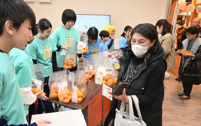6年の高野伶菜さん(12)は「頑張って収穫したみかんを多くの人に買ってもらいうれしい。甘酸っぱさを楽しんでほしい」と笑顔で話した。名古屋市の中村謙佑さん(40)は「子どもたちが収穫したと聞いて行列に並んだ。食べるのが楽しみ」と話した。