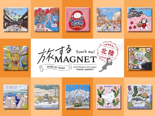 地球や社会の課題解決につながるものづくりを行う株式会社ペノン(本社:東京都千代田区)が展開する『旅するマグネット』は、日本の全国各地で活躍する“ご当地クリエイター”とタッグを組み、各地域の観光名所や歴史・文化をテーマにしたイラストをサステナブル素材のマグネットに落とし込んだ、地域共創型の新しい仕組みのおみやげです。このたび、北陸3県(石川・富山・福井)の絵柄が出揃い、北陸エリアのコンプリートを達成しました。