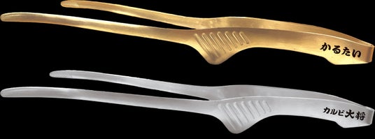 ●金銀オリジナルトングセット 24cm×1.5cm 各1本カルビ大将のトングはどの向きで置いても先端がテーブルにつかないので、衛生的です。焼肉を焼くのにはもちろん、料理用のトングとしても活用していただけます。