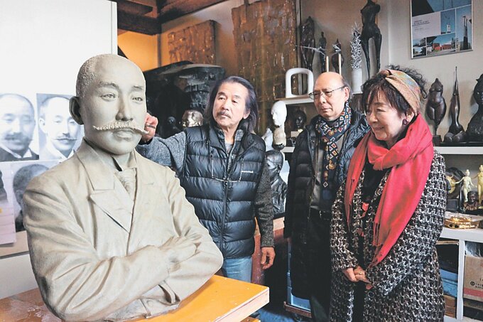 高頭さんは夫の直樹さんと共に、原型制作を担う同市京町の彫刻家、楢原北悠さん(72)の工房を訪れた。高頭さんが寄せた林の功績を紹介する銘板の内容や、水粘土でできた原型を確認。「穏やかで優しい顔つきになった。建立のために尽力してくださっている方々に大変感謝している」と話した。胸像は市内の鋳物関係者らでつくる「林忠正銅像制作委員会」が建立を目指している。原型制作や鋳物の仕上げは楢原さんが担い、鋳型制作や鋳造は市内の鋳物メーカー、平和合金が行う。