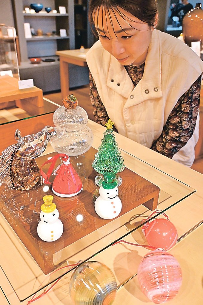 クリスマスやお正月向けの作品を集めた企画展が、富山ガラス工房(富山県富山市古沢)で開かれている。北欧をイメージしたオーナメントや来年のえとにちなんだ馬のオブジェなどで心躍る雰囲気をつくり出している。