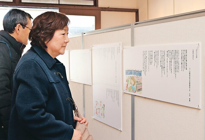 ポエム大賞・北日本新聞社賞を受けたつくば開成高校静岡校2年、石川野雅さんの「豆州やまきち」のほか、富山銀行賞、最優秀賞、優秀賞を受賞した11作品のパネルが並ぶ。パネルにはイラストレーターの北山知絵子さん(高岡市)が描いた挿絵が添えられ、作品ごとの世界観を伝えている。