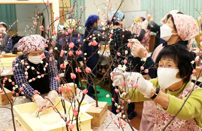 正月を彩る「もち花」作りが5日、富山県魚津市北鬼江の市高齢者いきいきセンターで行われ、市シルバー人材センターの30人が作業に励んだ。一般向けに販売するほか賛助企業などに贈る。