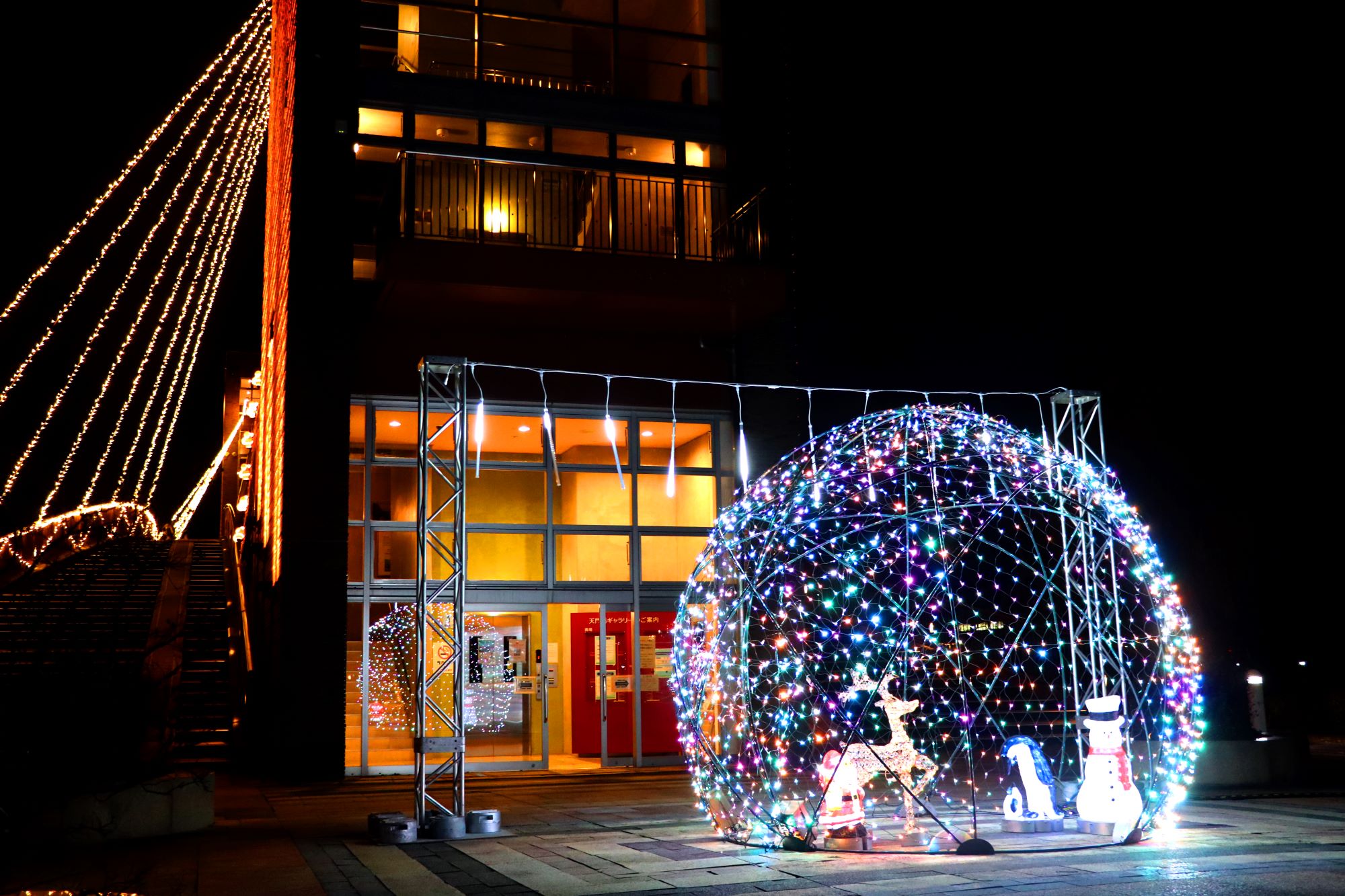 天門橋北側に直径約3メートルのイルミネーションドームを設置。中にはサンタクロースや雪だるま、トナカイのオブジェが並び、夜の環水公園をちょっと華やかに彩っています。