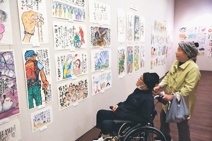 昨年の第1回に続き、ウェルビーイングをテーマに同館が募集。全国から約千点が寄せられ、このうち入賞作を中心に約700点を並べた。クレヨンや筆ペンなどを用いた優しいタッチの作品に、来場者が見入っていた。