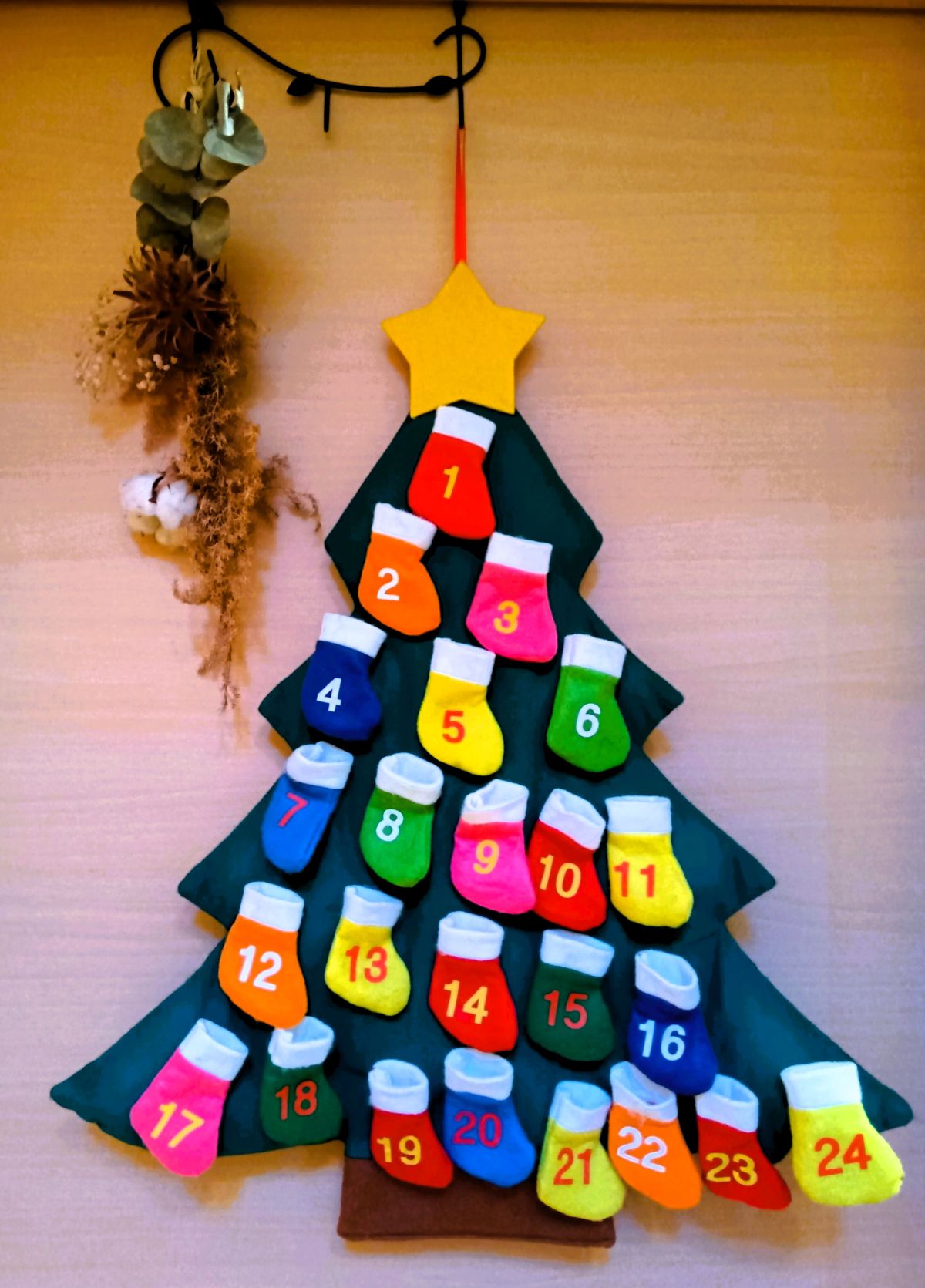 良さげなアドベントカレンダーはないかと探していたところ、かわいい布製のものを発見❗️気に入っていましたが、ブーツが小さくて、入れられるお菓子があまりなくて困りました💦(紙に【ポッキー】などお菓子名を書いて入れ、出たお菓子を渡したこともあります)