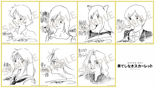 細田監督は、まだ『果てしなきスカーレット』の制作期間中だった今年の夏、「こうして新しいチャレンジを続けられるのは、これまで応援し続けてくださった方々がたくさんいらっしゃったから」と、ファンへの感謝を込めて7人のヒロインを一枚一枚丁寧に描き下ろしたという。年月を経た今もなお、どのキャラクターを描く際にも迷いはなく、次々と色紙に命が吹き込まれていった。