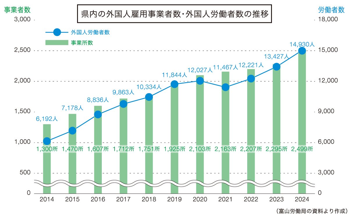 雇用する事業所数も、前年比8・9%増の2499カ所となり、過去最多を更新した。従業員数が30人未満の小規模な事業所が、全体の6割を占めている。富山労働局は「日本の若い人を雇用したくても確保できず、大企業のように機械化で人材不足を補うことも難しい小規模な事業所が、足りない労働力を外国人に担ってもらっているケースが多い」とみている。
