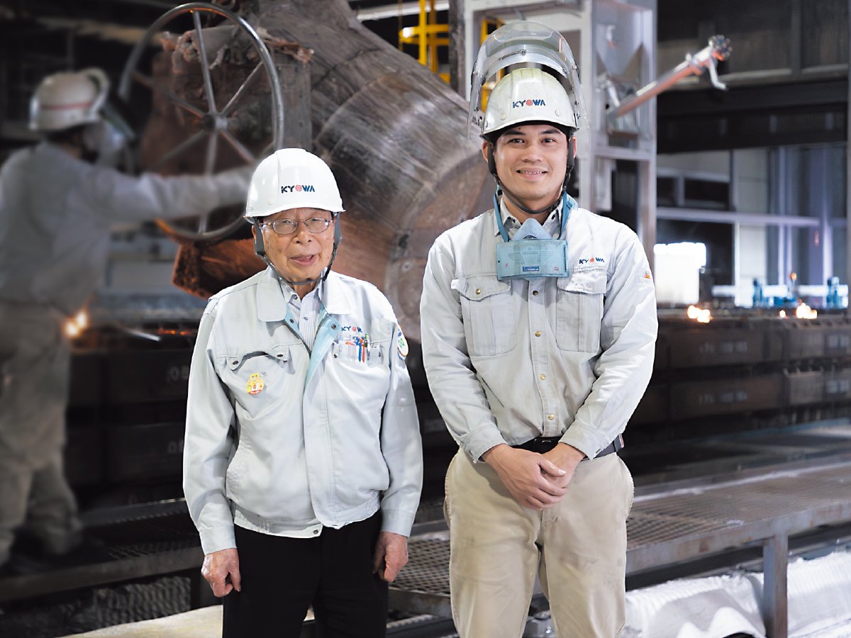 外国人への指導は、3日間の安全教育からスタートする。まだ日本語が拙い実習生にビデオやテキストを使って注意すべき点を伝え、各職場へ。その後も、指導役が節目ごとに行われる技能検定試験に合格できるようサポートしていく。メンドーザさんも実習生として最長の5年間働いた後、特定技能1号に移行。2号になれば在留期間を延ばし、家族を呼び寄せることができることから、2号に必要な鋳造技能士1級への挑戦を決めた。学科試験は日本語のみで行われるため、会社は過去の問題を集め、漢字にローマ字で読み方を記し、英訳を付けた手作りテキストを作成。メンドーザさんは必死に勉強し、合格を手にした。この結果が他の外国人たちの励みとなり、今年新たに2人が鋳造技能士1級に合格した。早川社長は「資格を持った技術者が増えることは、会社にとっても大きなメリットになる」と喜ぶ。