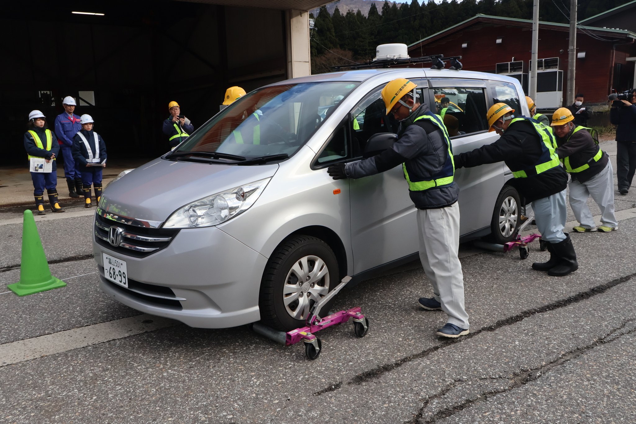 放置車両の移動訓練では、参加者がタイヤ付きジャッキで乗用車を浮かせて動かした。布製チェーンを装着する体験もあった。