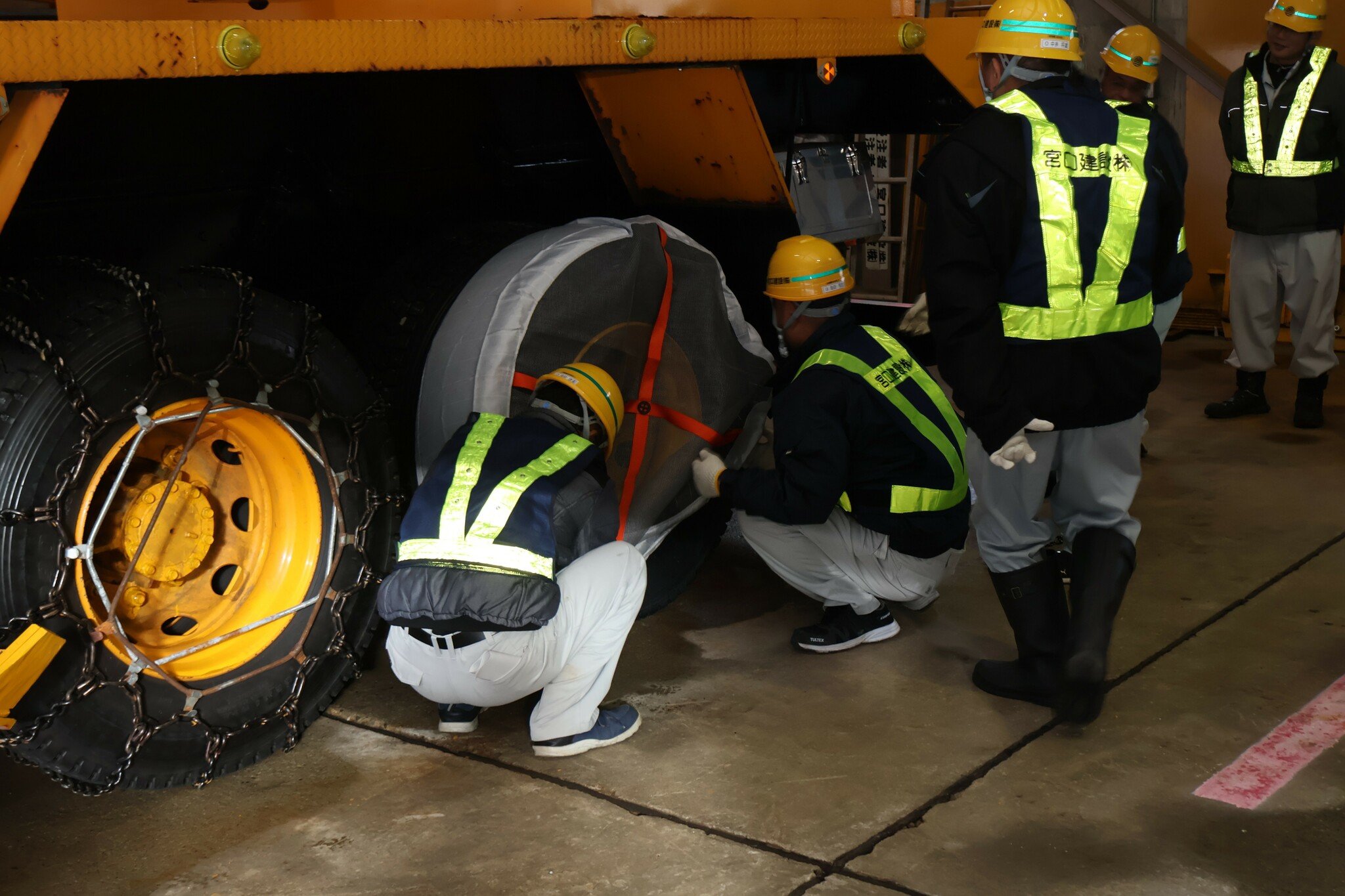 国土交通省富山河川国道事務所は9日、富山市片掛の除雪ステーションで大雪による立ち往生を想定した車両移動訓練を行った。同事務所職員や除雪業者ら44人が走行不能車両を動かす手順を確認した。