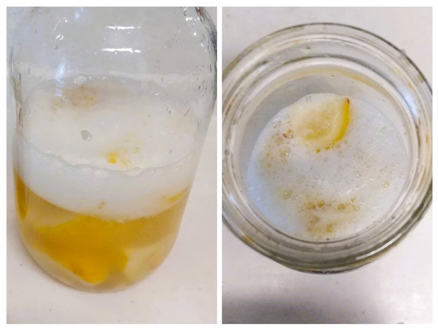 容器を振ってふたを開けると、こんなにしゅわしゅわ!白いオリが沈んでいれば完成です!