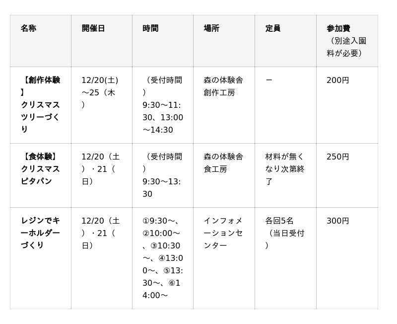 森の体験舎では、松ぼっくりなどの自然素材でつくる「クリスマスツリーづくり」を開催。親子で楽しめるオリジナルツリー制作です。さらに、クリスマス前の2日間限定の「クリスマスピタパン」も登場。焼きたてのピタパンにキウイやバナナ、ホイップを挟んだ、絶妙な味わいをお楽しみいただけます。インフォメーションセンターでは、LEDレジンで雪の結晶などの封入パーツを閉じ込める「レジンでキーホルダーづくり」を実施。冬ならではの思い出づくりにおすすめのプログラムです。