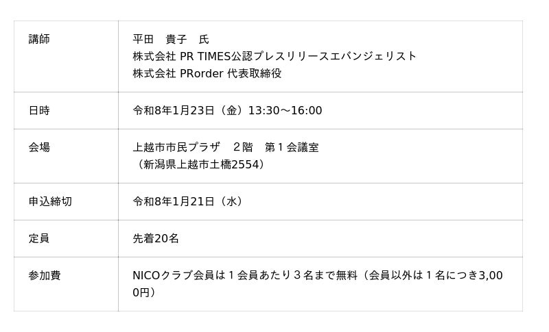 今回は、株式会社PR TIMES公認プレスリリースエバンジェリスト・株式会社Prorder代表取締役 平田 貴子氏による、地方中小企業者のためのプレスリリース&広報・PR入門セミナーを上越市内で開催します。