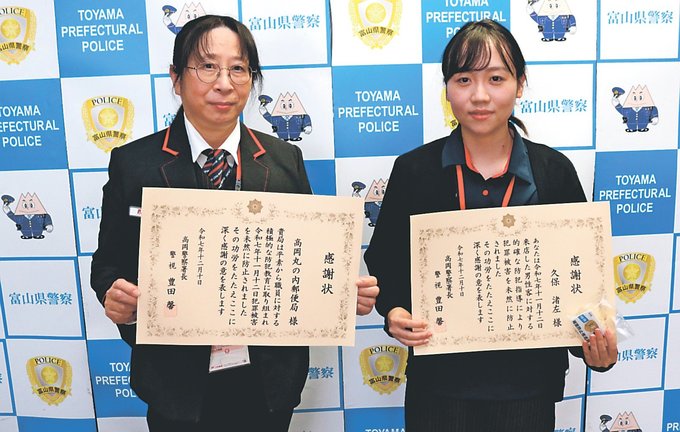 警察官をかたる特殊詐欺(オレオレ詐欺)の被害を未然に防いだとして、富山県の高岡署は10日、高岡丸の内郵便局(中山浩一局長)と局員の清水智子さん、久保渚左(なぎさ)さんに署長感謝状を贈った。