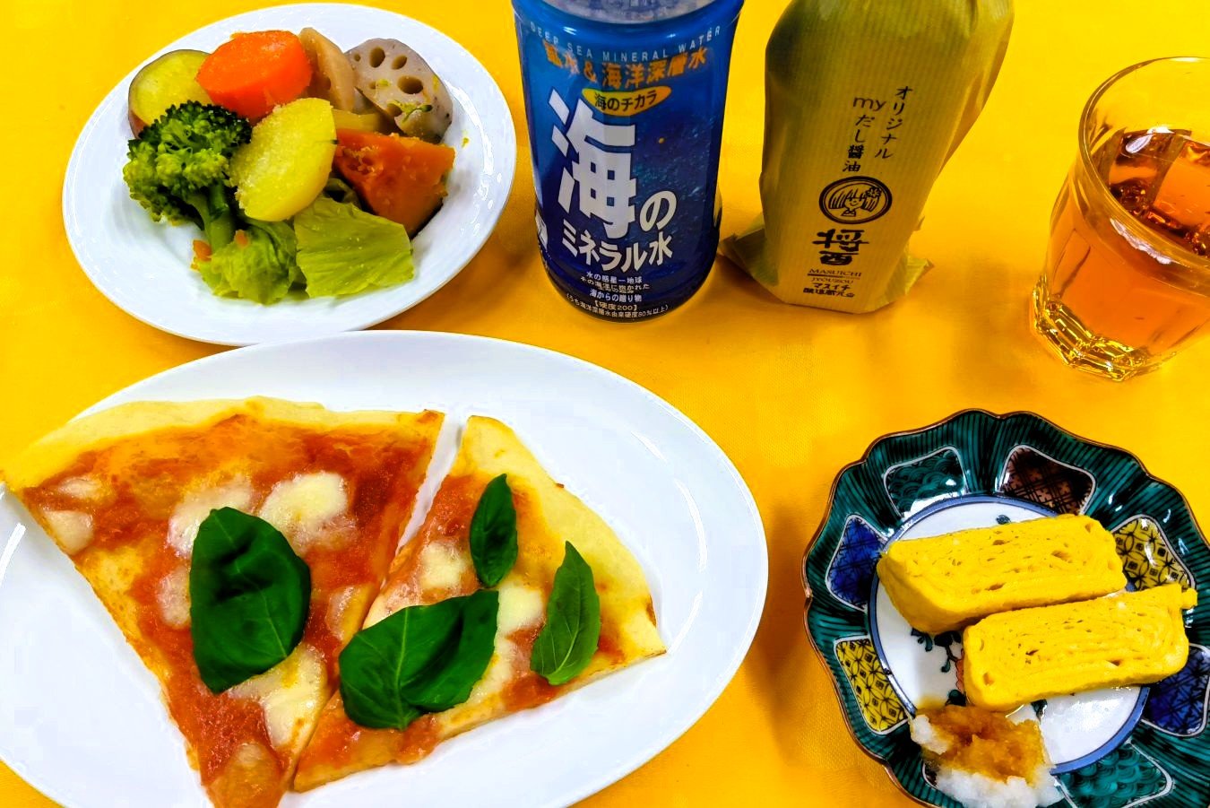 ピザは普通の生地よりもっちもち。冷めてもおいしかったです😊蒸し野菜はとても甘く、塩でさらにおいしくいただけました。(だし醤油をかけてもGood👍)