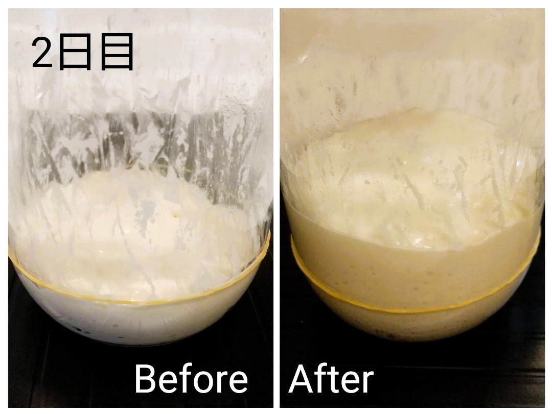 ② 前日と同様に2倍くらいに膨らんだら冷蔵庫で一晩寝かせる。