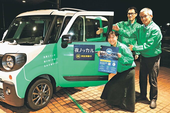 一般ドライバーが夜間移動の足を担う社会実証運行「夜ノッカル」が12日、富山県朝日町で始まった。自家用有償旅客運送の枠組みを活用して町が実施。タクシーが少ない時間帯のニーズを把握し、公共交通サービスの将来性を探る。初日は1件の予約があった。