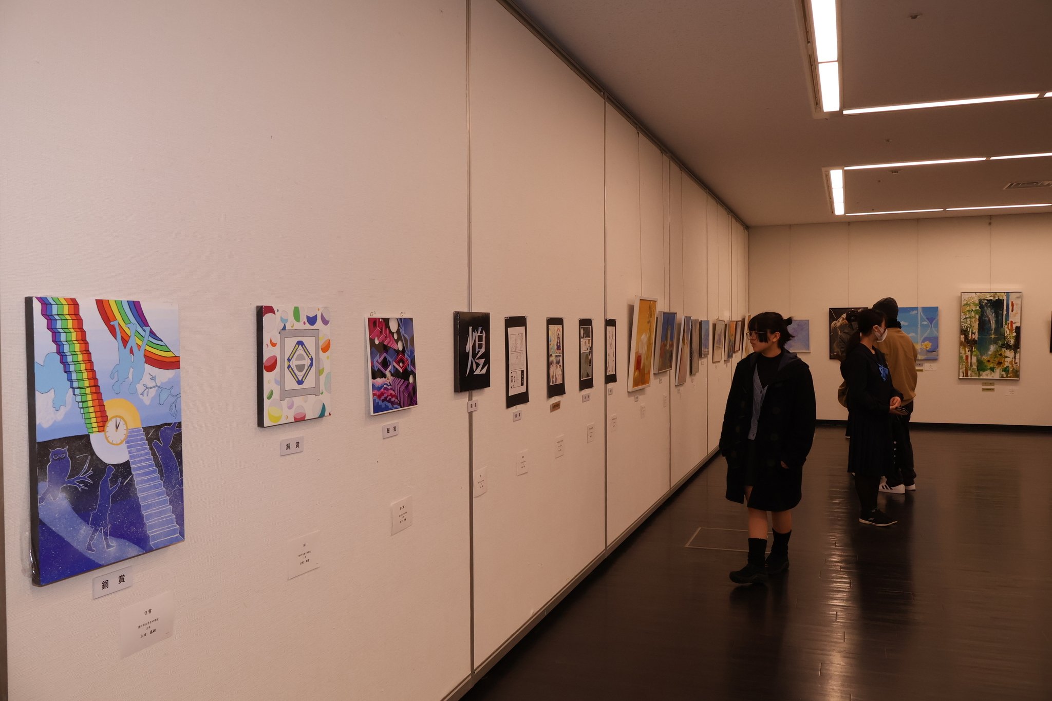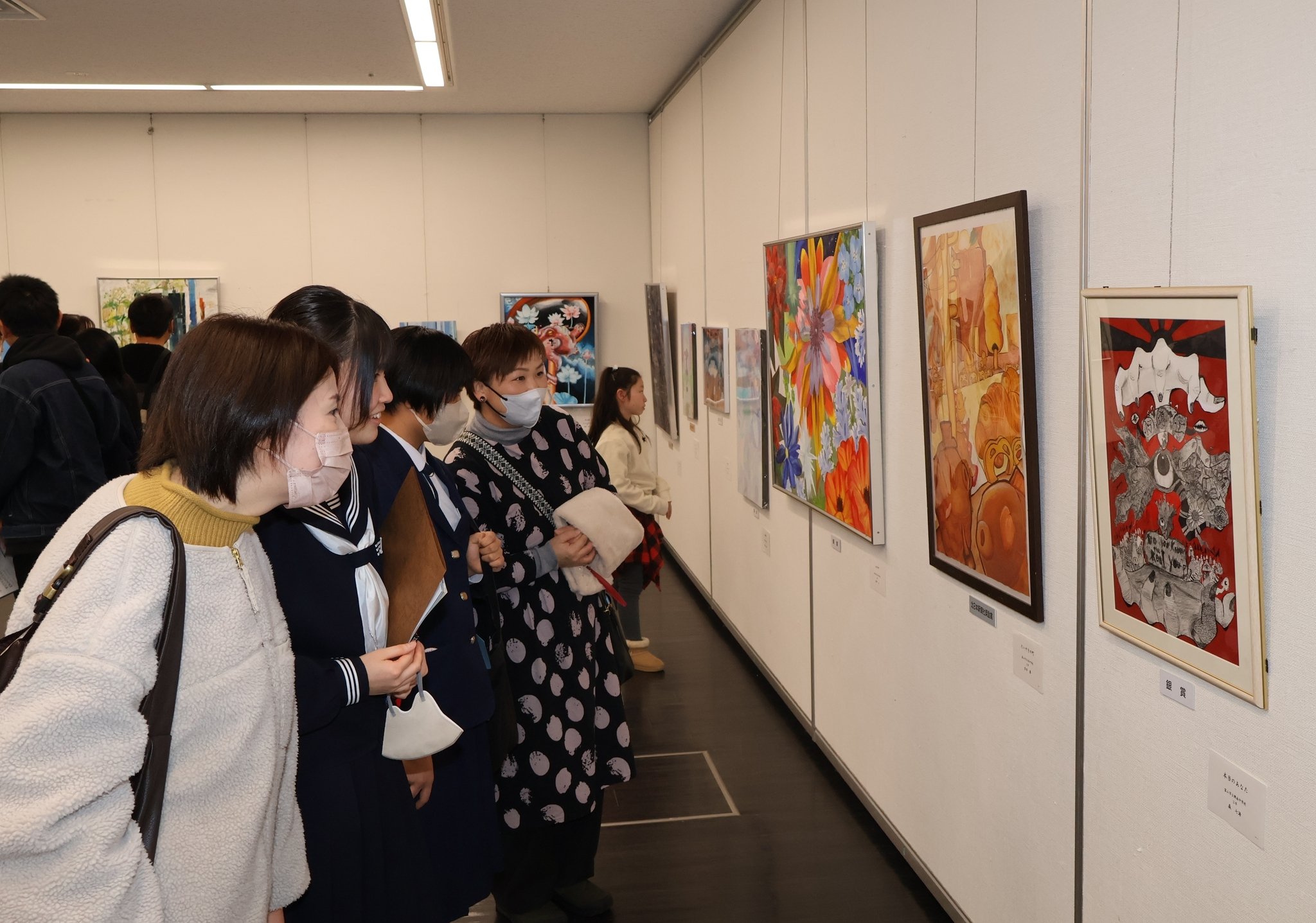会場には流星が空を駆け抜ける一瞬を描いた大賞受賞作の絵画をはじめ、緻密に構成されたデザイン作品、伝統行事を捉えた写真など、個性豊かな作品の数々が並ぶ。出品した生徒や家族らが訪れ、作品をじっくりと鑑賞したり、感想を語り合ったりしていた。