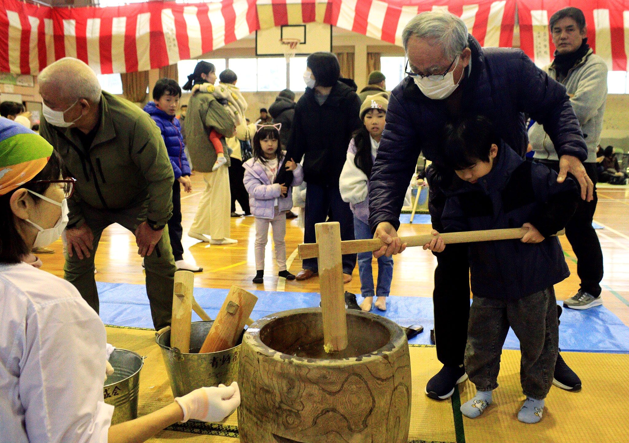 第40回年忘れジャンボもちつき大会が14日、黒部市宇奈月町の下立まちおこしセンター体育館であり、地区住民ら約230人が楽しいひとときを過ごした。